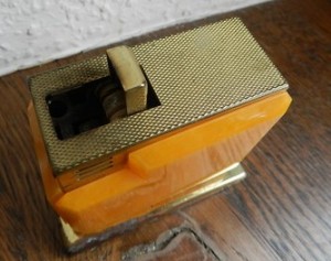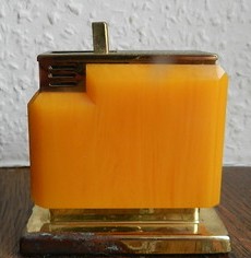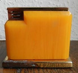 Bernsteinfarbenes Tisch Feuerzeug. Glas Bakelt Bernstein? Kein Plastik! Mit Kindersicherung. Das Feuerzeug ist leer, daher keine gewähr. 7×7,5x4cm.