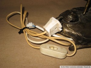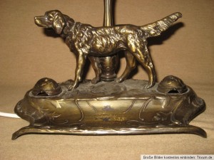 SCHREIBTISCHSET MIT BELEUCHTUNG . UM WELCHES METALL ES SICH HIER HANDEL KANN ICH NICHTS SAGEN – KÖNNTE BRONZE ABER AUCH MESSING SEIN – BEI DER LAMPE MIT ZWISCHENSCHALTER MÜSSTE DAS KABEL( IN BRAUN oder SCHWARZ) MAL ERNEUERT WERDEN. UNTER DEN 2 DECKEL BEFANDEN SICH BESTIMMT GLASEINSÄTZ FÜR TINTE – DIE ABER NICHT MEHR VORHANDEN SIND – KANN MAN BESTIMMT ÜBER EBAY ERWERBEN !