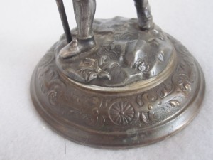 wahrscheinlich bronze versilbert.starke patina.der sockel ist bronzefarben und mit reichlich ornamenten verziert.